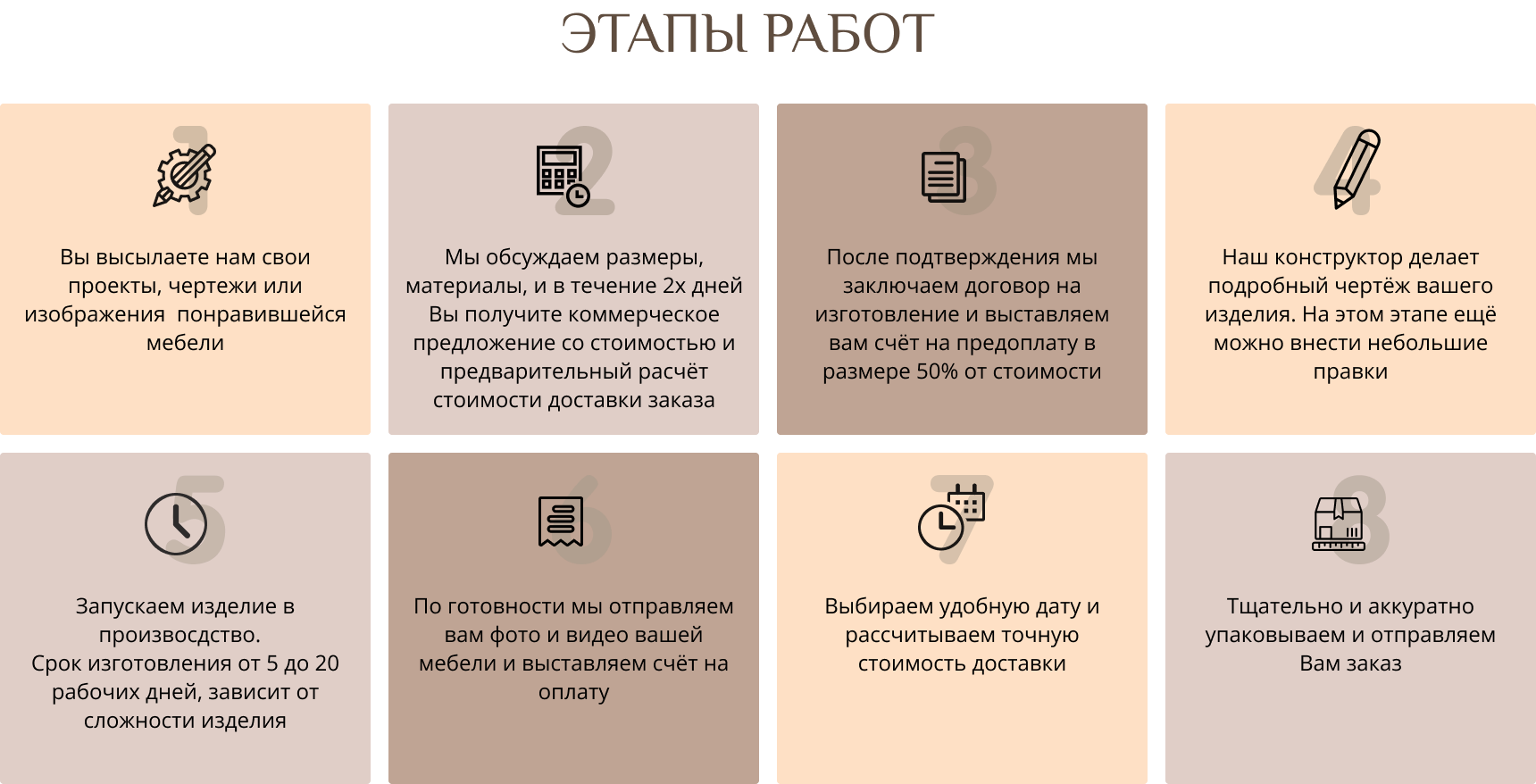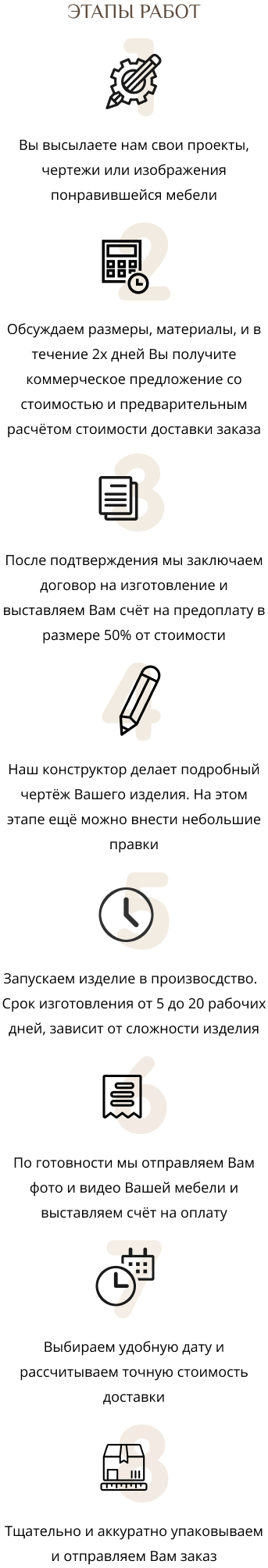 Мы разрабатываем мебель по индивидуальным проектам для частных и юридических лиц, дизайнеров и архитекторов. Для заказа необходимо всего лишь оставить контактные данные или связаться с менеджером и рассказать о ваших пожеланиях. Мы предоставляем гарантию на 10 лет и создаем мебель в кратчайшие сроки от 5 рабочих дней.