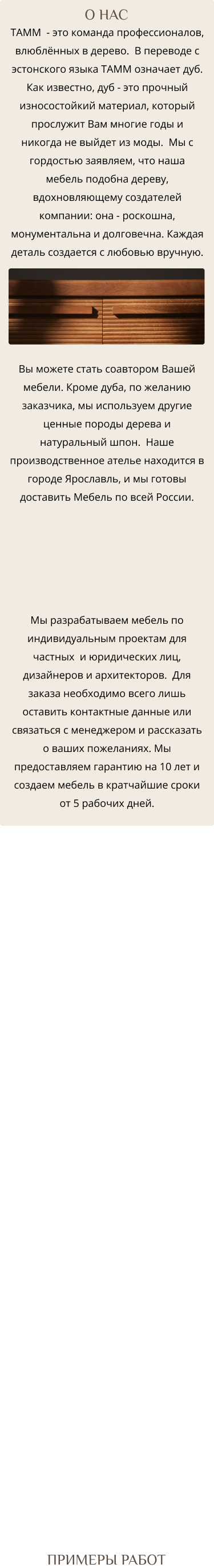 ТАММ - это команда профессионалов, влюблённых в дерево. В переводе с эстонского языка ТАММ означает дуб. Как известно, дуб - это прочный износостойкий материал, который прослужит Вам многие годы и никогда не выйдет из моды. Мы с гордостью заявляем, что наша мебель подобна дереву, вдохновляющему создателей компании: она - роскошна, монументальна и долговечна. Каждая деталь создается с любовью вручную.