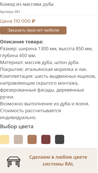Сделаем! Мы создадим любую мебель в необходимом именно вам размере и цвете. Разработаем короче или выше, прямую или угловую, потемнее или посветлее. Возможно, вы хотите уникальный дизайн? Достаточно просто рассказать о задумке и мы воплотим ее в жизнь.